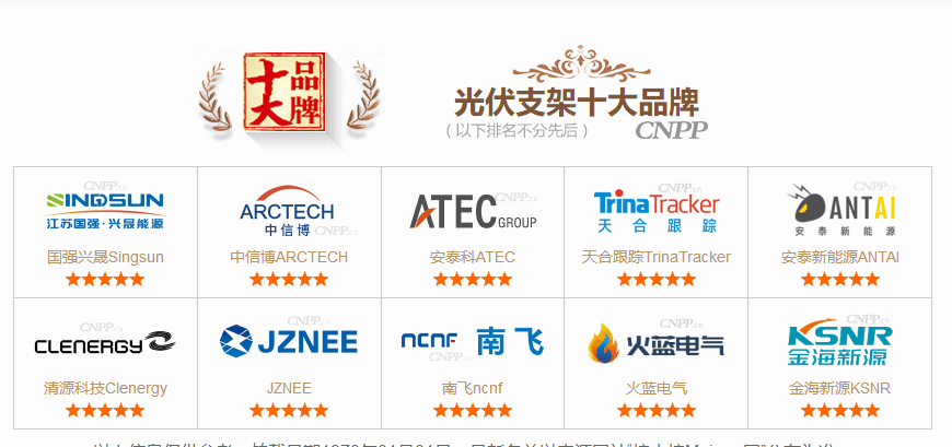 杏彩体育官网光伏支架指的即是为了摆放、安设、固定太阳能面板策画的卓殊的支架,正在安设太阳能光伏面板的时刻,光伏支架的安设是很首要的一个合节。那么光伏支架选什么牌子好?依据CNPP品牌榜中榜大数据钻研院和CN10排排榜手艺钻研院最新揭晓的《光伏支架品牌排行榜》数据名单,上榜的十大光伏支架品牌有:国强兴晟、中信博、安笑科、安笑新能源、清源、天合跟踪、JZNEE、南飞、火蓝电气、金海新源等,沿途来明白下吧。